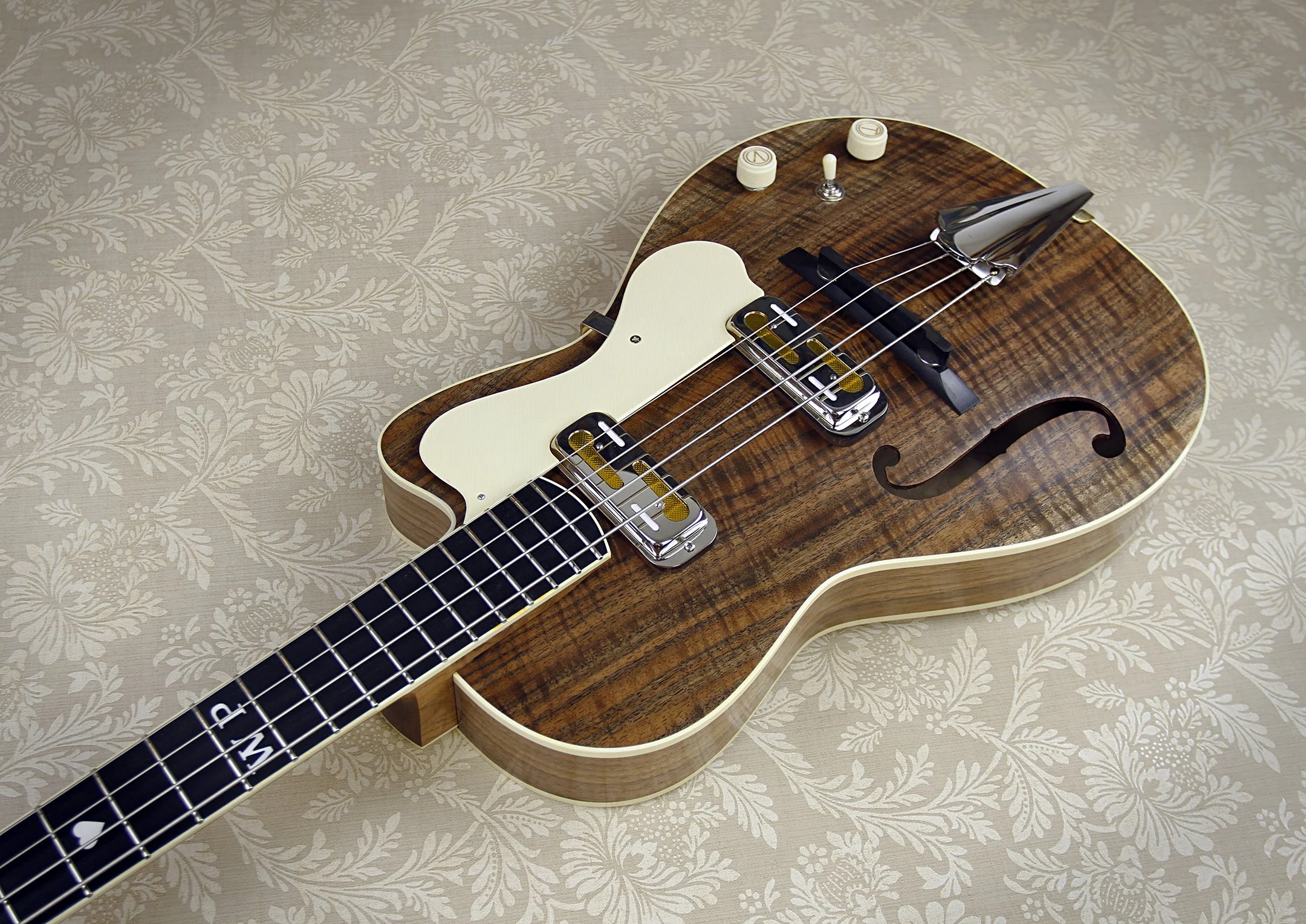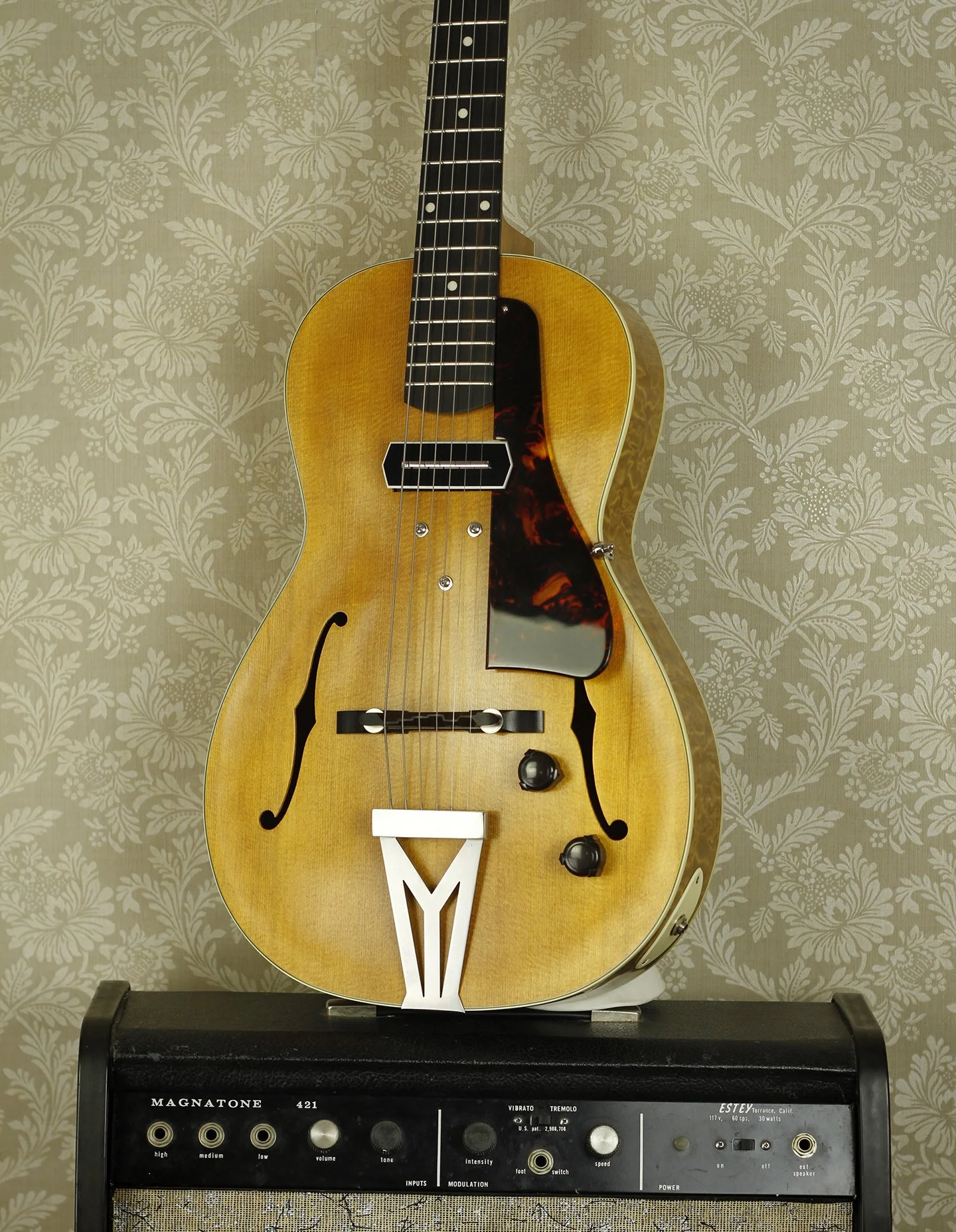 The instrument can be tuned to either A or G standard, depending on the string gauge, and features a 9” lower bout which most likely makes it the smallest archtop guitar you will ever come across.