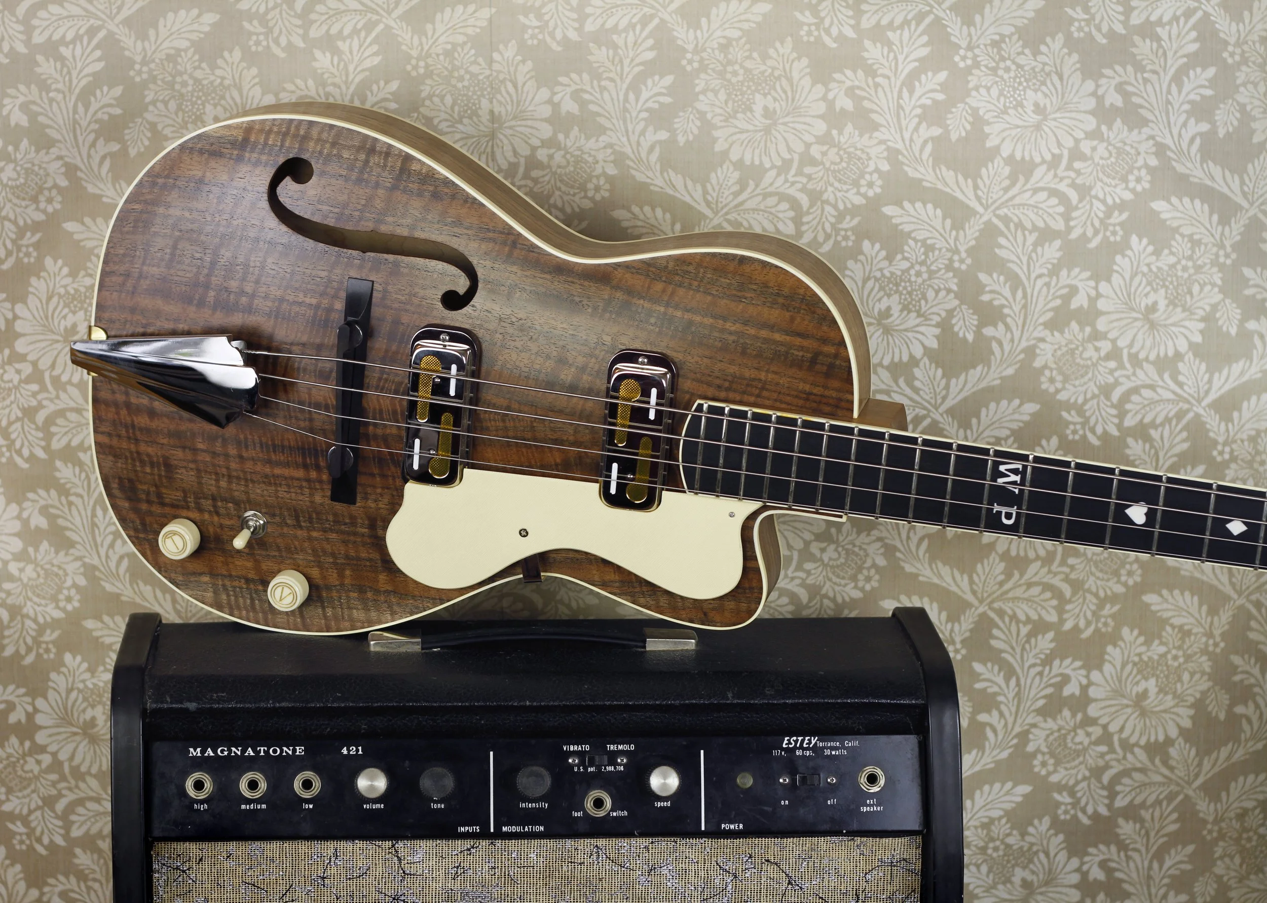 This is a walnut guitar with a laminated/arched maple top, mahogany neck and ebony fingerboard - other new features on the M3 include a slim 2” deep body, Venetian cutaway, Bigsby B3 vibrato system and a pair of airy Curtis Novak pickups (black foil in neck and kay style pancake in bridge).